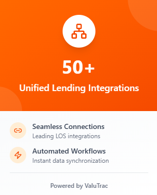 ValuTrac connects with leading LOS platforms (such as Abrigo Sageworks, Encompass, MeridianLink), supports seamless, secure data exchange to fit into your existing tech stack.